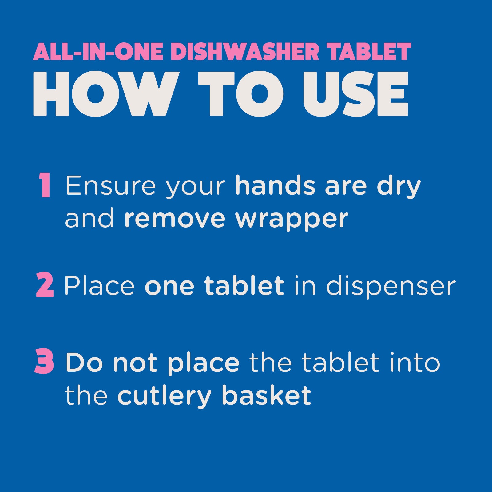 Our ALL-IN-ONE dishwasher tablets unleash the power of biodegradable ingredients to leave your dishes squeaky clean. They already contain rinse aid and salt action so you just have to pop the tablet in and run the machine.